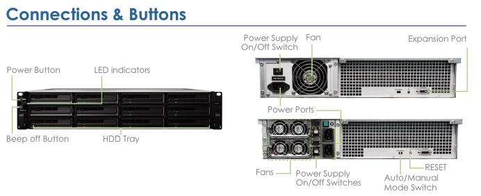 Synology RX1214RP delivers an effortless solution for volume expansion and data backup for Synology RackStation RS2414+/RS2414RP+. The RX1214RP seamlessly scales up the storage capacity of the Synology RS2414+/RS1214RP+ by an additional 12 hard drives on the fly when connected directly to an expansion cable.